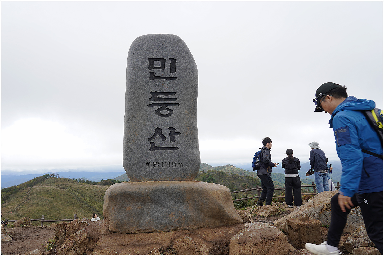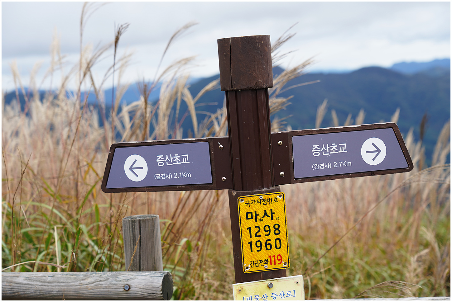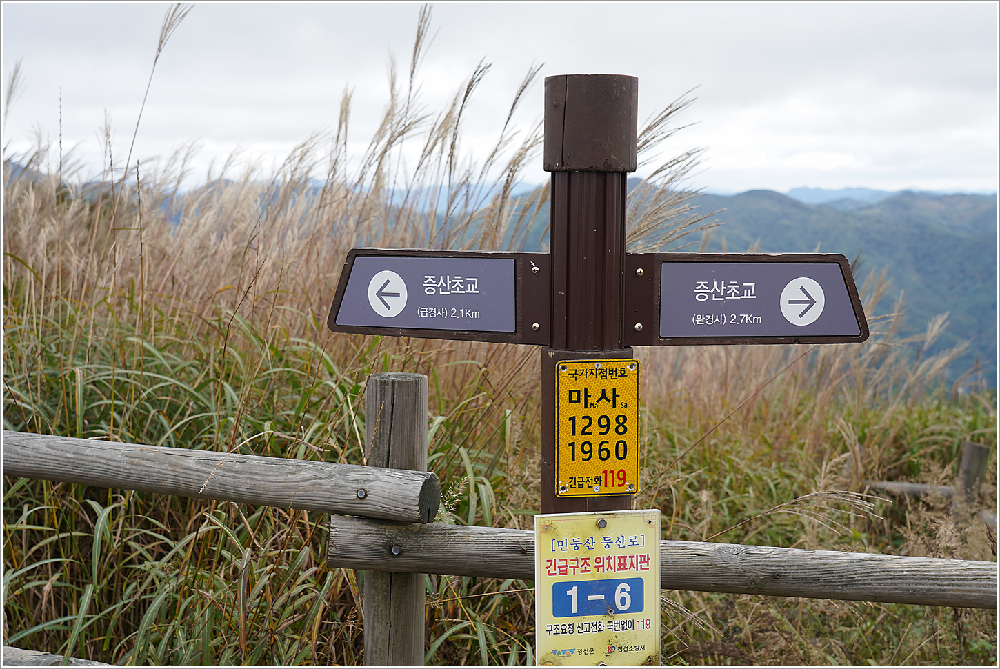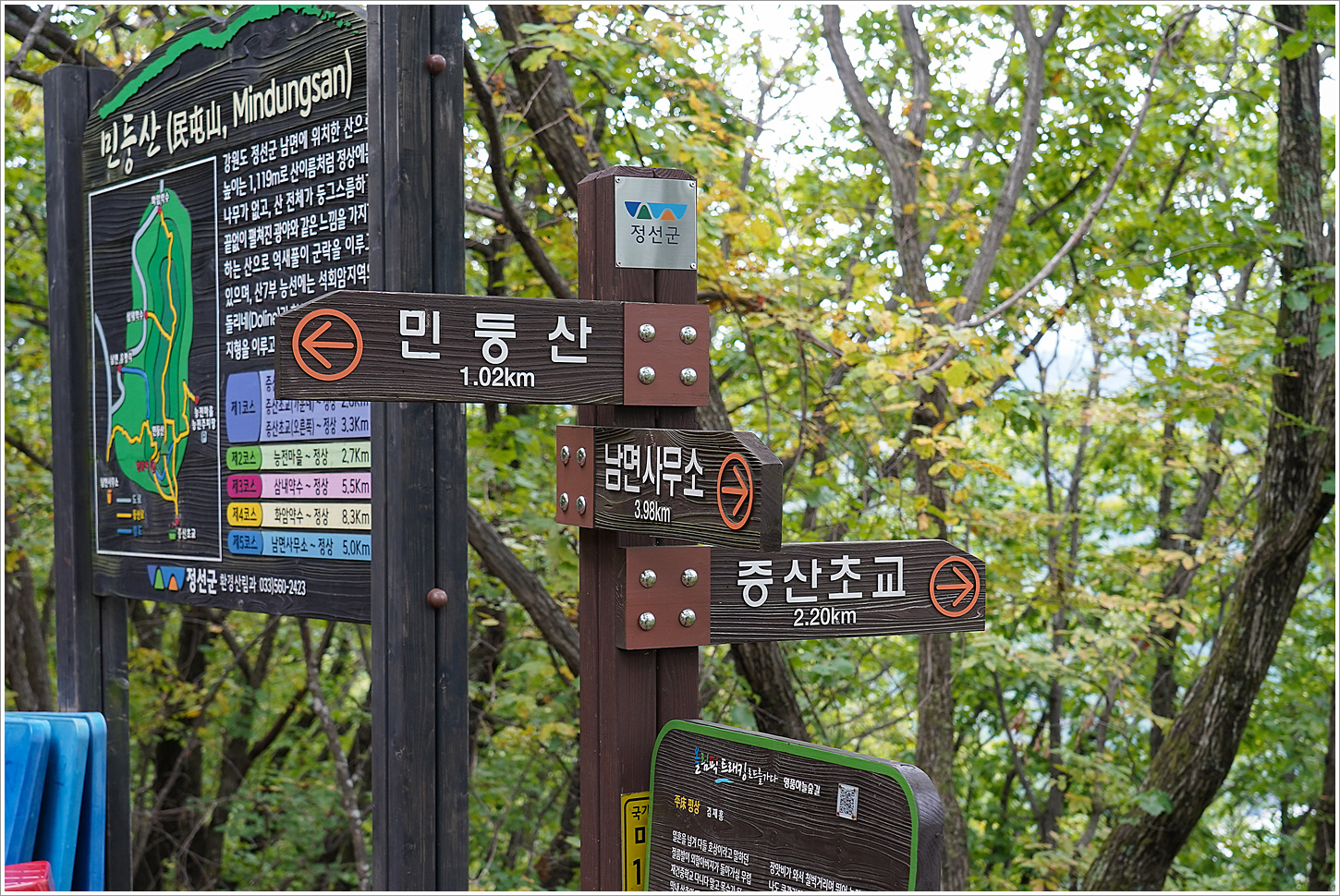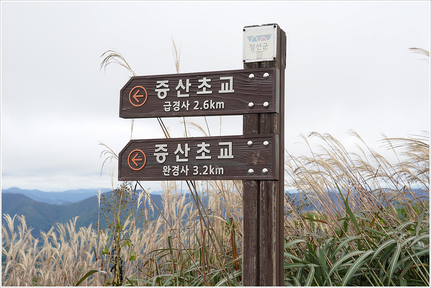 민둥산 제1주차장(축제장 장소) : 강원 정선군 남면 무릉리 784-1 (입장료, 주차료 없음)"민둥산 가는 길" 정선선 철로 아래로 난 길로 들어서면 증산초등학교를 만날 수 있으며... 정선역 방향은 왼쪽이고, 민둥산역 방향은 오른쪽이다.민둥산 돌리네 소개증산초등학교 아래 민둥산 등산안내소 (무료)주차장 주소 : 강원도 정선군 남면 민둥산로 4증산초교 앞 주차장 길 건너편 민둥산 등산로 입구 계곡의 짧은 다리를 건너서면 본격적인 산행이 시작된다.등산로 입구 들머리에서 조금 올라오니 두 갈래 길로 나누어지는 갈림길이 나오는데, 오른쪽 민둥산(완경사) 3.3km로 표기되어 있는 발구덕 코스로 우회해서 편하게 올라갈 수 있는 길이고... 왼쪽 민둥산(급경사) 2.6km로 표기된 방향표지목 따라 제1코스 왼쪽 길로 들어선다.증산초교에서 400m 올라온 지점에 다시 두 갈래 길로 나누어지는 방향표지목에 오른쪽 급경사(2.2km)로 표기되어 코스는 짧지만, 왼쪽 완경사(2.8km)로 올라갔다가 오른쪽 급경사로 내려오기로 하고... 시계방향으로 진행하기로 한다.낙엽송이 우거진 오솔길로 탐방로가 이어지고...증산초교에서 2.2km 올라오니 임도 길에 화장실도 있고, 간이 매점이 있어 잠시 한 숨 돌리고 쉬어간다.청량한 낙엽송 군락지의 울창한 숲이 인상적이다.하늘에 닿을 듯이 곧게 뻗어있는 낙엽송이 장쾌하고 시원스럽다.낙엽송이 빼곡하게 늘어선 숲길로 이어지고...증산초교에서 완경사로 2.6km 올라온 지점에 두 번째 임도 길에 세워진 방향 표지봉에 민둥산 정상 0.4km로 표기되어 있다.임도를 가로질러 전망쉼터가 있는 받침목 나무 계단을 따라 올라간다.억새밭 사이로 조성된 오르막길 탐방로를 따라 올라서니... 급경사(2.1km) 코스로 올라오는 탐방로와 합류하게 된다.정상에 올라갔다가 다시 이곳으로 되돌아와서 내려가야 할 급경사 방향 뷰억새가 아직 활짝 피지는 않았지만, 능선에 뒤덮인 억새가 바람에 살랑거린다.억새가 능선을 따라 바람에 일렁이며 펼쳐지는 탐방로를 따라 민둥산 정상에 오른다.활짝 피지는 않는 억새가 가을바람 따라 이리저리 가을하늘을 배경으로 하늘거리며 가을 분위기를 자아내고 있다.민둥산 정상에는 정상표지석(해발 1119m)이 우뚝 서 있고, 탁 트인 경치에 억새밭을 감상할 수 있으며... 물이 고여 있는 독특한 지형 돌리네와 시원스레 펼쳐지는 조망이 일품인 민둥산 산행의 묘미가 느낄 만하다.민둥산 정상에서 구름이 내려앉은 동쪽 덕산 방향민둥산 정상에서 바라본 동쪽 물레봉, 함백산 방향민둥산 정상에서 남쪽 방향, 무릉리 증산농공단지가 조망된다.민둥산 정상에서 바라본 남서쪽의 마대산, 예미산, 삼태산 방향민둥산 정상에서 바라본 서쪽 곰봉, 백운산, 돌도끼산 방향민둥산 정상에서 바라본 서북쪽 백덕산, 왕재산, 기우산 방향민둥산 정상에서 북쪽으로 독특한 지형을 이루고 있는 돌리네 뷰 왼쪽 봉우리 너머로 구름에 덮인 발왕산 방향석회암 지대에서 빗물에 암석이 녹으면서 웅덩이처럼 형성된 지형을 '돌리네'라고 한다고 한다. 물이 고여있는 원형 돌리네가 장관을 연출하고 있다.정상에서 증산초교 방향의 하산길은... 올라올 때 완경사 코스로 올라왔으니까 내려갈 때는 급경사로 내려가기로 한다.정상에서 내려서면서 바라본 능선길에 억새 군락을 이루며 산행인 들에게 가을의 정취를 한껏 선사하고 있다.완경사 코스로 올라오면서... 급경사 코스로 올라오는 탐방로와 합류되는 갈림길에서 봤던 방향표지봉에서 하산할 때는 증산초교 급경사 2.1km로 표기된 방향으로 이동한다.급경사 하산길로 접어들며 뒤돌아본 민둥산 정상 방향이 오름길에 보았던 것과는 다른 매력적인 풍광이 펼쳐진다.정상에서 15분 정도 내려서니 임도 길에 세워진 방향표지봉에 증산초교(급경사) 1.8km로 표기되어 있는 방향으로 하산길을 이어간다.높고 푸른 소나무 숲속 길을 따라 걷기만 해도 피톤치드가 가득한 맑은 공기와 함께 몸과 마음이 정화되어 상쾌해지는 기분이 든다.정상에서 1.3km로 내려오면 만나는 임도 길에 새워진 민둥산 등산로 안내도정상에서 35분쯤 내려오니 임도 길에 세워진 방향표지목에 표기된 양방향 1.3km로 딱 중간 지점에 이른다.하산길에 낙엽송이 빼곡한 울창한 숲을 이루고 있어 장관이다.하산길에 유일하게 가을옷으로 물드리며 갈아입는 가을 단풍을 마중하다.억새축제 행사 주차장으로 원점 회귀하면서 민둥산 가을 억새 마중 산행을 마무리한다.