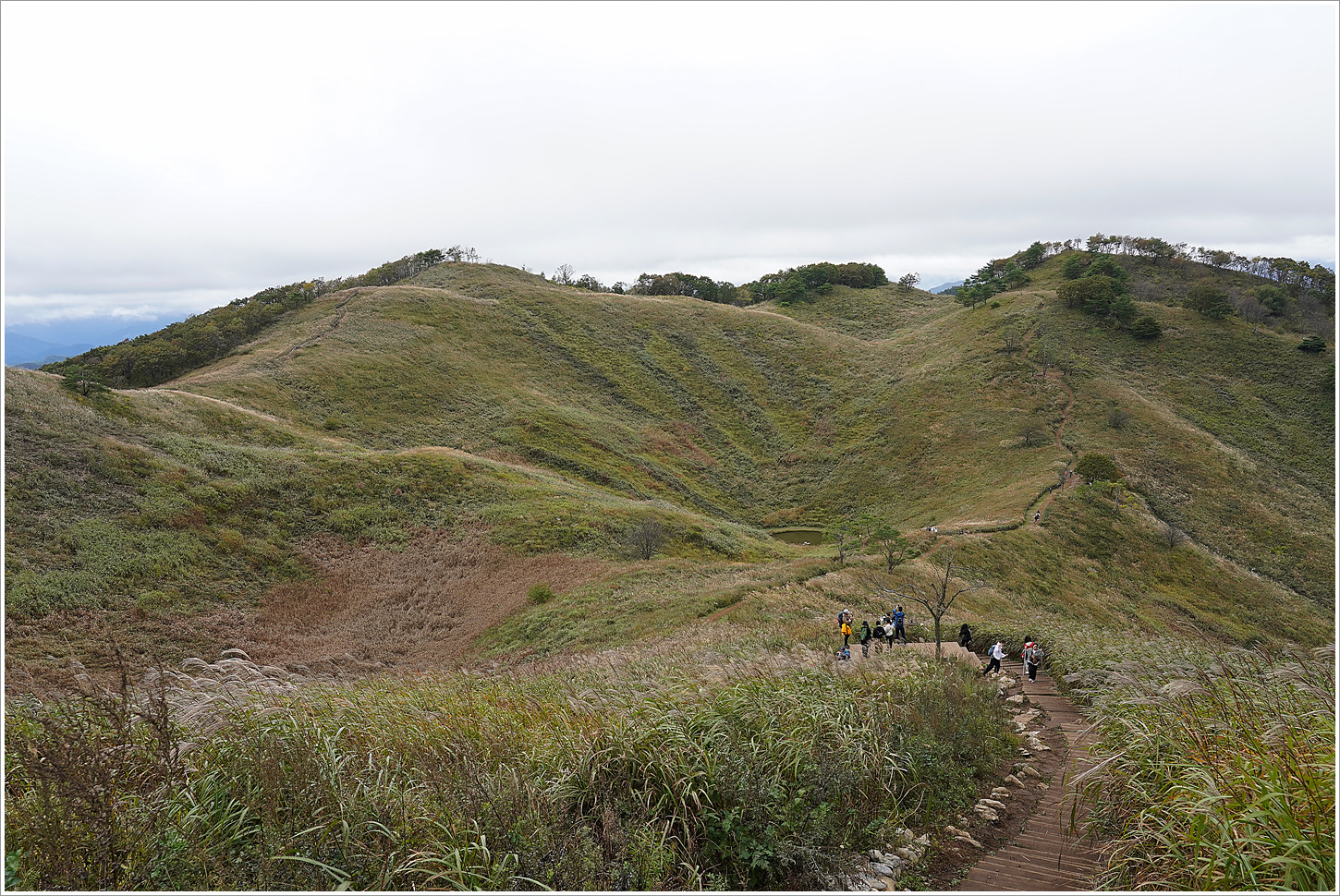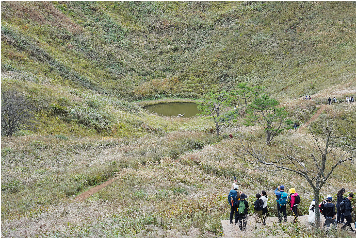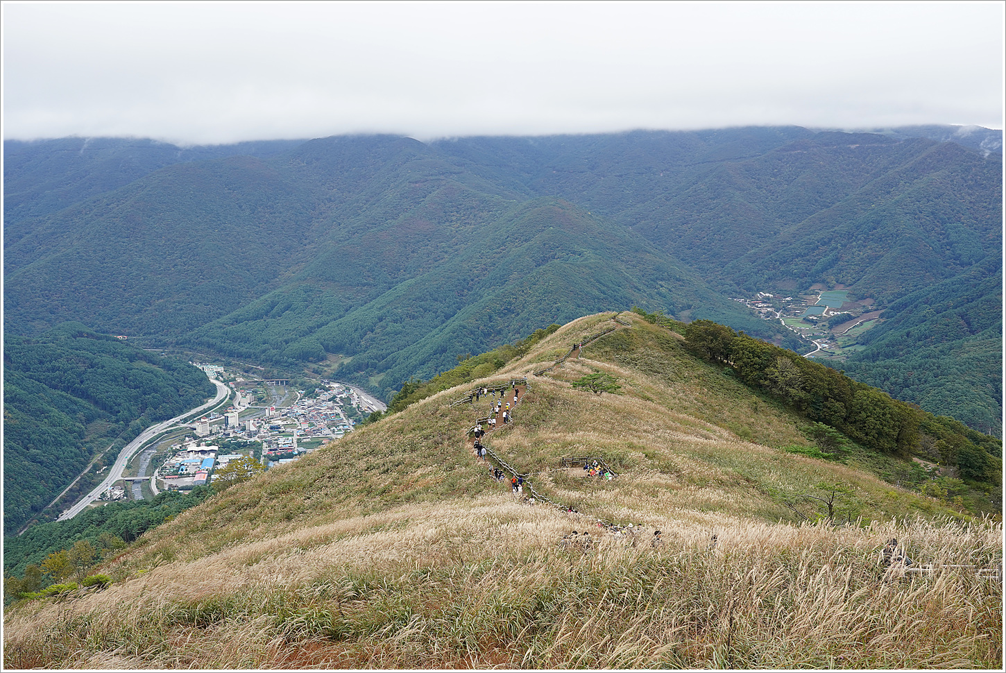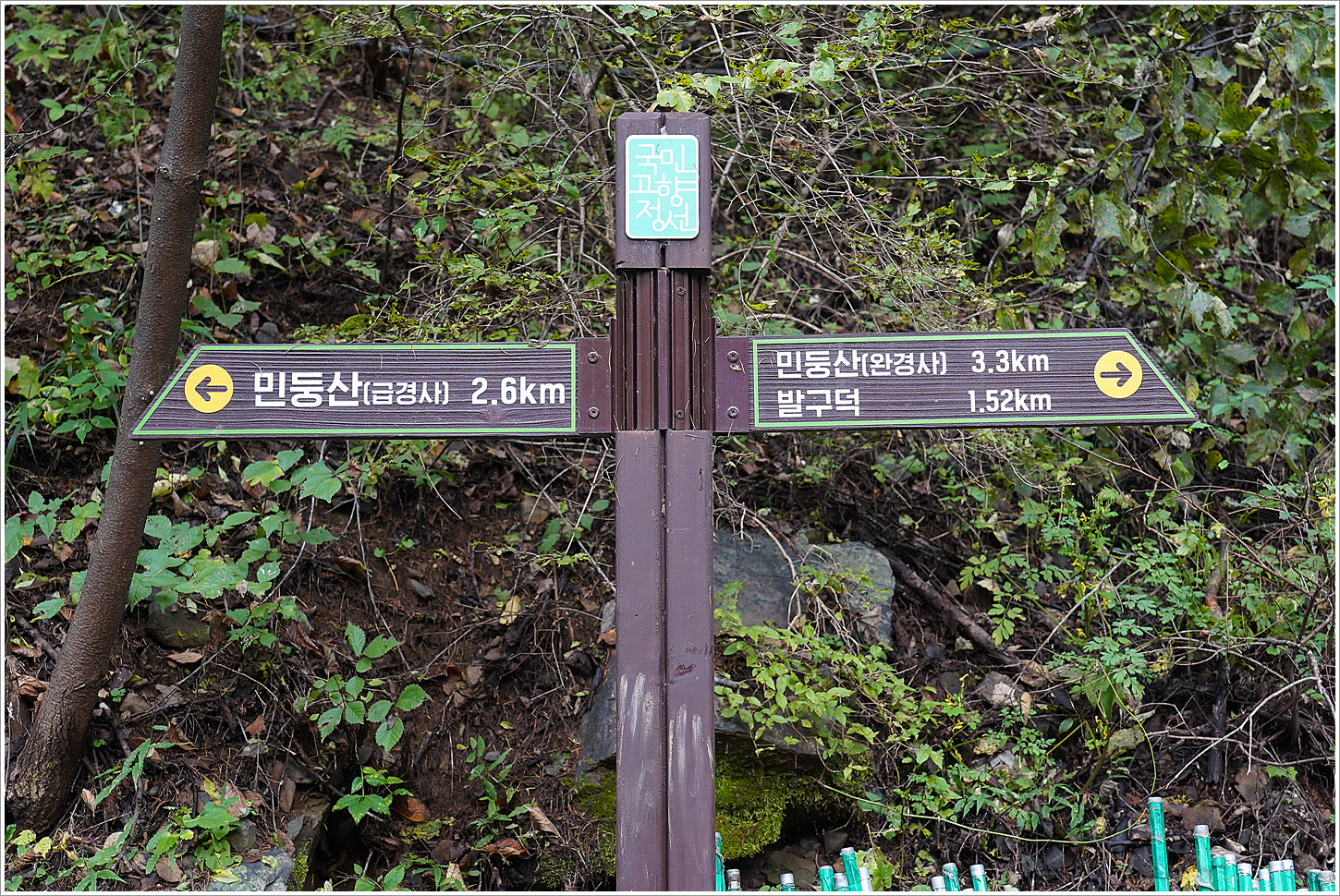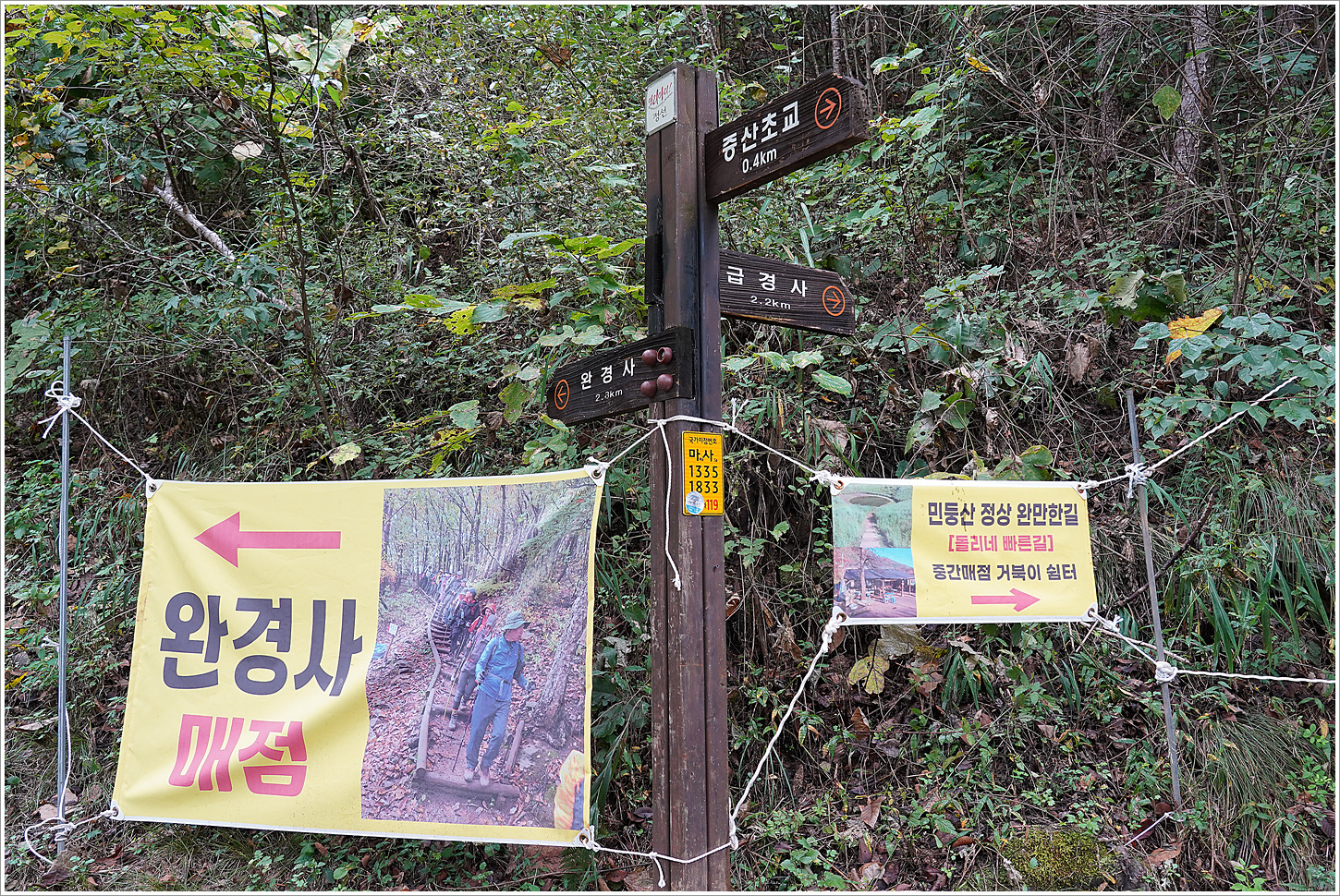 민둥산 제1주차장(축제장 장소) : 강원 정선군 남면 무릉리 784-1 (입장료, 주차료 없음)"민둥산 가는 길" 정선선 철로 아래로 난 길로 들어서면 증산초등학교를 만날 수 있으며... 정선역 방향은 왼쪽이고, 민둥산역 방향은 오른쪽이다.민둥산 돌리네 소개증산초등학교 아래 민둥산 등산안내소 (무료)주차장 주소 : 강원도 정선군 남면 민둥산로 4증산초교 앞 주차장 길 건너편 민둥산 등산로 입구 계곡의 짧은 다리를 건너서면 본격적인 산행이 시작된다.등산로 입구 들머리에서 조금 올라오니 두 갈래 길로 나누어지는 갈림길이 나오는데, 오른쪽 민둥산(완경사) 3.3km로 표기되어 있는 발구덕 코스로 우회해서 편하게 올라갈 수 있는 길이고... 왼쪽 민둥산(급경사) 2.6km로 표기된 방향표지목 따라 제1코스 왼쪽 길로 들어선다.증산초교에서 400m 올라온 지점에 다시 두 갈래 길로 나누어지는 방향표지목에 오른쪽 급경사(2.2km)로 표기되어 코스는 짧지만, 왼쪽 완경사(2.8km)로 올라갔다가 오른쪽 급경사로 내려오기로 하고... 시계방향으로 진행하기로 한다.낙엽송이 우거진 오솔길로 탐방로가 이어지고...증산초교에서 2.2km 올라오니 임도 길에 화장실도 있고, 간이 매점이 있어 잠시 한 숨 돌리고 쉬어간다.청량한 낙엽송 군락지의 울창한 숲이 인상적이다.하늘에 닿을 듯이 곧게 뻗어있는 낙엽송이 장쾌하고 시원스럽다.낙엽송이 빼곡하게 늘어선 숲길로 이어지고...증산초교에서 완경사로 2.6km 올라온 지점에 두 번째 임도 길에 세워진 방향 표지봉에 민둥산 정상 0.4km로 표기되어 있다.임도를 가로질러 전망쉼터가 있는 받침목 나무 계단을 따라 올라간다.억새밭 사이로 조성된 오르막길 탐방로를 따라 올라서니... 급경사(2.1km) 코스로 올라오는 탐방로와 합류하게 된다.정상에 올라갔다가 다시 이곳으로 되돌아와서 내려가야 할 급경사 방향 뷰억새가 아직 활짝 피지는 않았지만, 능선에 뒤덮인 억새가 바람에 살랑거린다.억새가 능선을 따라 바람에 일렁이며 펼쳐지는 탐방로를 따라 민둥산 정상에 오른다.활짝 피지는 않는 억새가 가을바람 따라 이리저리 가을하늘을 배경으로 하늘거리며 가을 분위기를 자아내고 있다.민둥산 정상에는 정상표지석(해발 1119m)이 우뚝 서 있고, 탁 트인 경치에 억새밭을 감상할 수 있으며... 물이 고여 있는 독특한 지형 돌리네와 시원스레 펼쳐지는 조망이 일품인 민둥산 산행의 묘미가 느낄 만하다.민둥산 정상에서 구름이 내려앉은 동쪽 덕산 방향민둥산 정상에서 바라본 동쪽 물레봉, 함백산 방향민둥산 정상에서 남쪽 방향, 무릉리 증산농공단지가 조망된다.민둥산 정상에서 바라본 남서쪽의 마대산, 예미산, 삼태산 방향민둥산 정상에서 바라본 서쪽 곰봉, 백운산, 돌도끼산 방향민둥산 정상에서 바라본 서북쪽 백덕산, 왕재산, 기우산 방향민둥산 정상에서 북쪽으로 독특한 지형을 이루고 있는 돌리네 뷰 왼쪽 봉우리 너머로 구름에 덮인 발왕산 방향석회암 지대에서 빗물에 암석이 녹으면서 웅덩이처럼 형성된 지형을 '돌리네'라고 한다고 한다. 물이 고여있는 원형 돌리네가 장관을 연출하고 있다.정상에서 증산초교 방향의 하산길은... 올라올 때 완경사 코스로 올라왔으니까 내려갈 때는 급경사로 내려가기로 한다.정상에서 내려서면서 바라본 능선길에 억새 군락을 이루며 산행인 들에게 가을의 정취를 한껏 선사하고 있다.완경사 코스로 올라오면서... 급경사 코스로 올라오는 탐방로와 합류되는 갈림길에서 봤던 방향표지봉에서 하산할 때는 증산초교 급경사 2.1km로 표기된 방향으로 이동한다.급경사 하산길로 접어들며 뒤돌아본 민둥산 정상 방향이 오름길에 보았던 것과는 다른 매력적인 풍광이 펼쳐진다.정상에서 15분 정도 내려서니 임도 길에 세워진 방향표지봉에 증산초교(급경사) 1.8km로 표기되어 있는 방향으로 하산길을 이어간다.높고 푸른 소나무 숲속 길을 따라 걷기만 해도 피톤치드가 가득한 맑은 공기와 함께 몸과 마음이 정화되어 상쾌해지는 기분이 든다.정상에서 1.3km로 내려오면 만나는 임도 길에 새워진 민둥산 등산로 안내도정상에서 35분쯤 내려오니 임도 길에 세워진 방향표지목에 표기된 양방향 1.3km로 딱 중간 지점에 이른다.하산길에 낙엽송이 빼곡한 울창한 숲을 이루고 있어 장관이다.하산길에 유일하게 가을옷으로 물드리며 갈아입는 가을 단풍을 마중하다.억새축제 행사 주차장으로 원점 회귀하면서 민둥산 가을 억새 마중 산행을 마무리한다.