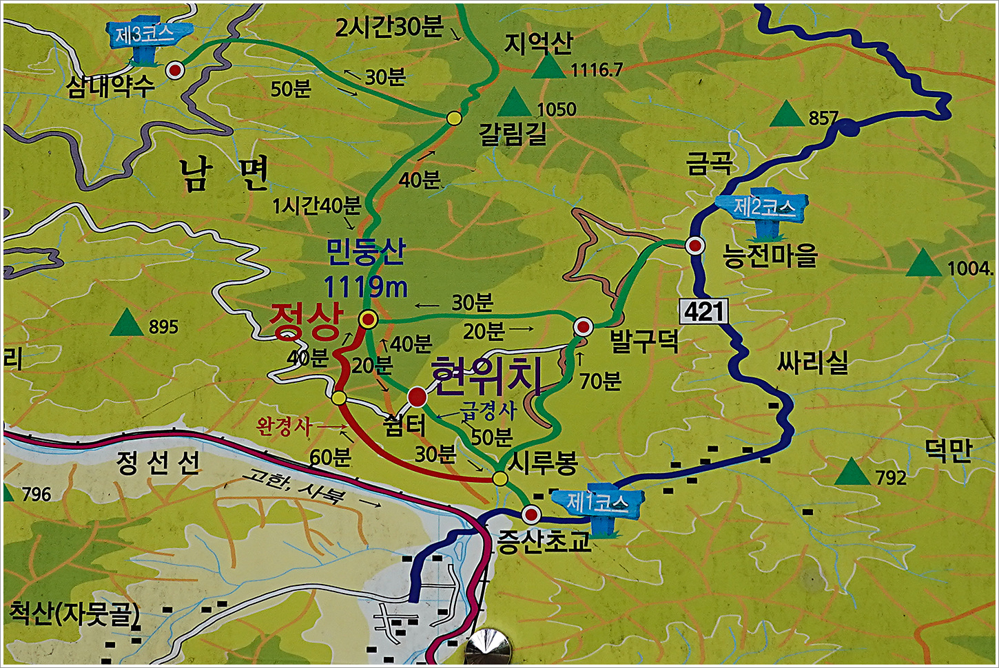 축제 행사장(제1주차장)에서 출발하여 지장천 삼거리교를 건너 증산초등학교 앞, 길 건너편 등산로 입구로 들어선 탐방로는 초반부터 가파른 오르막이 이어지며 소나무가 우거져 있는 울창한 숲길과 완만한 숲속 오솔길을 지나 낙엽송 숲길을 따라 임도 가로질러 올라가는 산 정상 부분은 나무가 거의 없는 민둥산(해발 1119m) 정상까지 1시간 40분 소요된다.